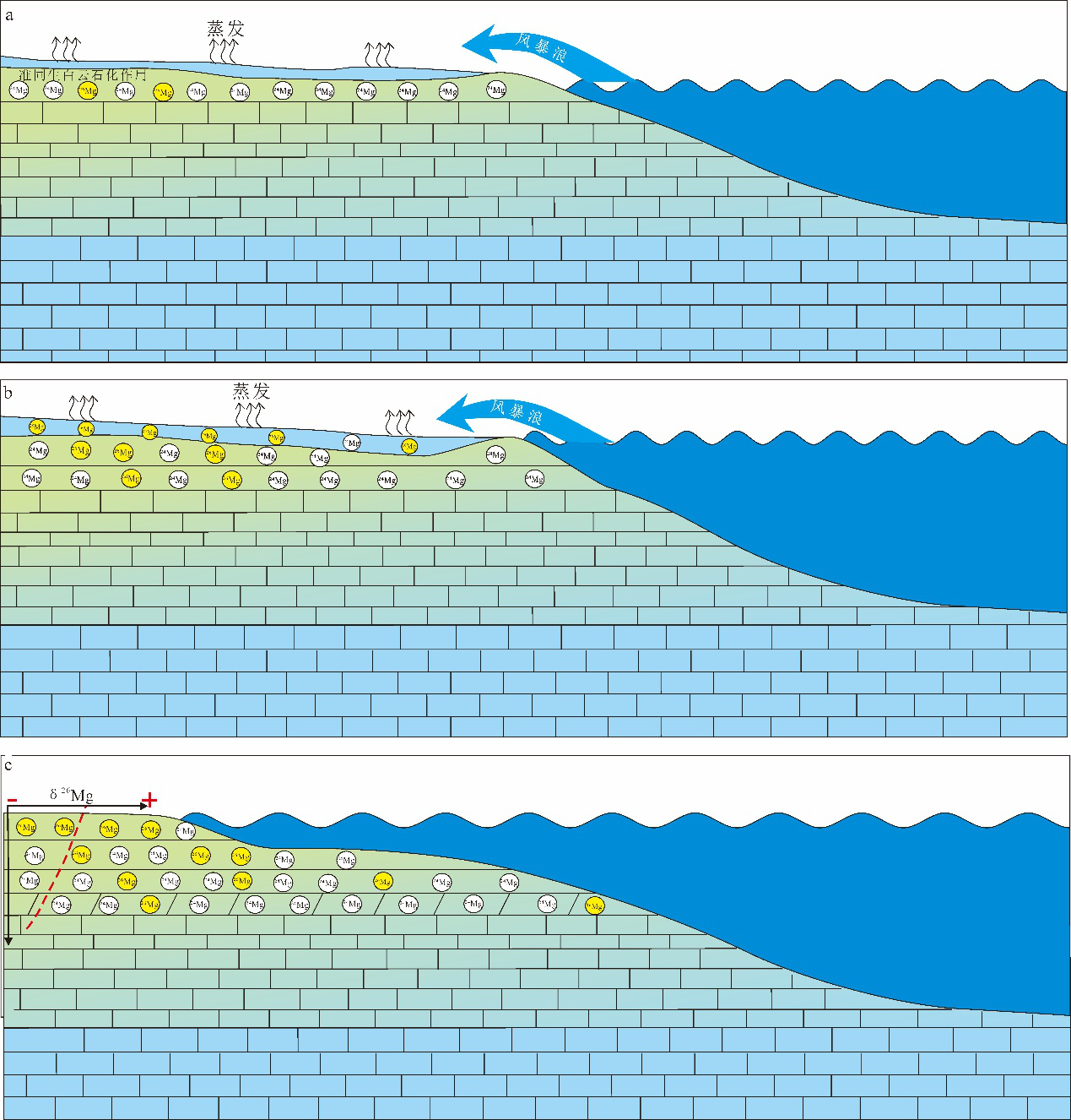 在渗透回流白云石化过程中,若白云石形成于接近白云石化流体源区的地方,白云石化流体主要发生垂向迁移,24Mg优先进入白云石晶格中,随着流体从顶部到底部垂向迁移,在垂直剖面中白云岩的Mg同位素值呈向下变重趋势(图4)。若远离白云石化流体源区(如潮下带),流体可能发生侧向迁移,在垂直剖面中Mg同位素值相对不变(图5)。在准同生萨布哈模型中,白云石形成于局限潮上带或潟湖,类似一个封闭体系,24Mg优先进入到早期形成的白云石晶格中,导致同沉积海水Mg同位素值变重,后期形成的白云石Mg同位素值也相应变重,垂直剖面中白云岩的Mg同位素值呈向上变重趋势(图6)。