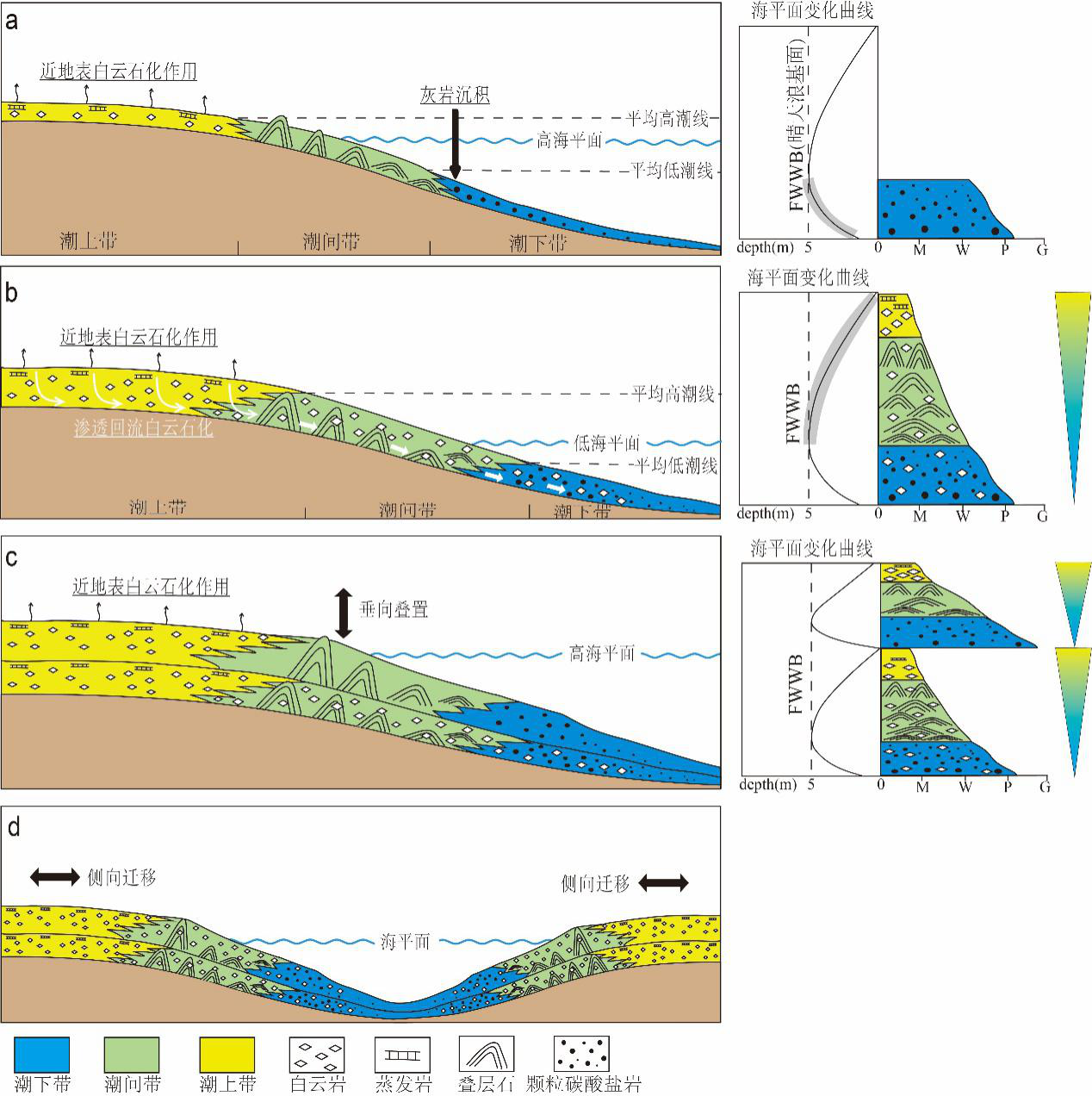 基于对覃家庙组厚层白云岩的白云石化过程研究,提出了厚层白云岩的成因模式(图8)。在高海平面时期,潮间带-潮下带沉积正常的灰岩(图8a)。随着海平面的降低,沉积环境逐渐向浅潮间带-潮上带演变,导致近地表白云石化作用,包括白云石的直接沉积(如微生物白云石化)或准同生白云石化作用,以及渗透回流白云石化作用的发生(图8b)。随着海平面的频繁波动,在垂向上,灰岩沉积-白云石化作用循环叠置(图8c);在横向上,浅水沉积相带(潮间带-潮上带)的侧向迁移导致整个碳酸盐岩台地发生白云石化(图8d)。不同期次白云石化作用的白云石化过程可能不同,取决于具体的沉积环境,包括物理-化学和水动力条件等。总的来说,厚白云岩的形成与海平面变化密切相关,不同沉积相带的侧向迁移和沉积旋回的垂向叠置导致了具台地尺度分布的厚层白云岩的形成。