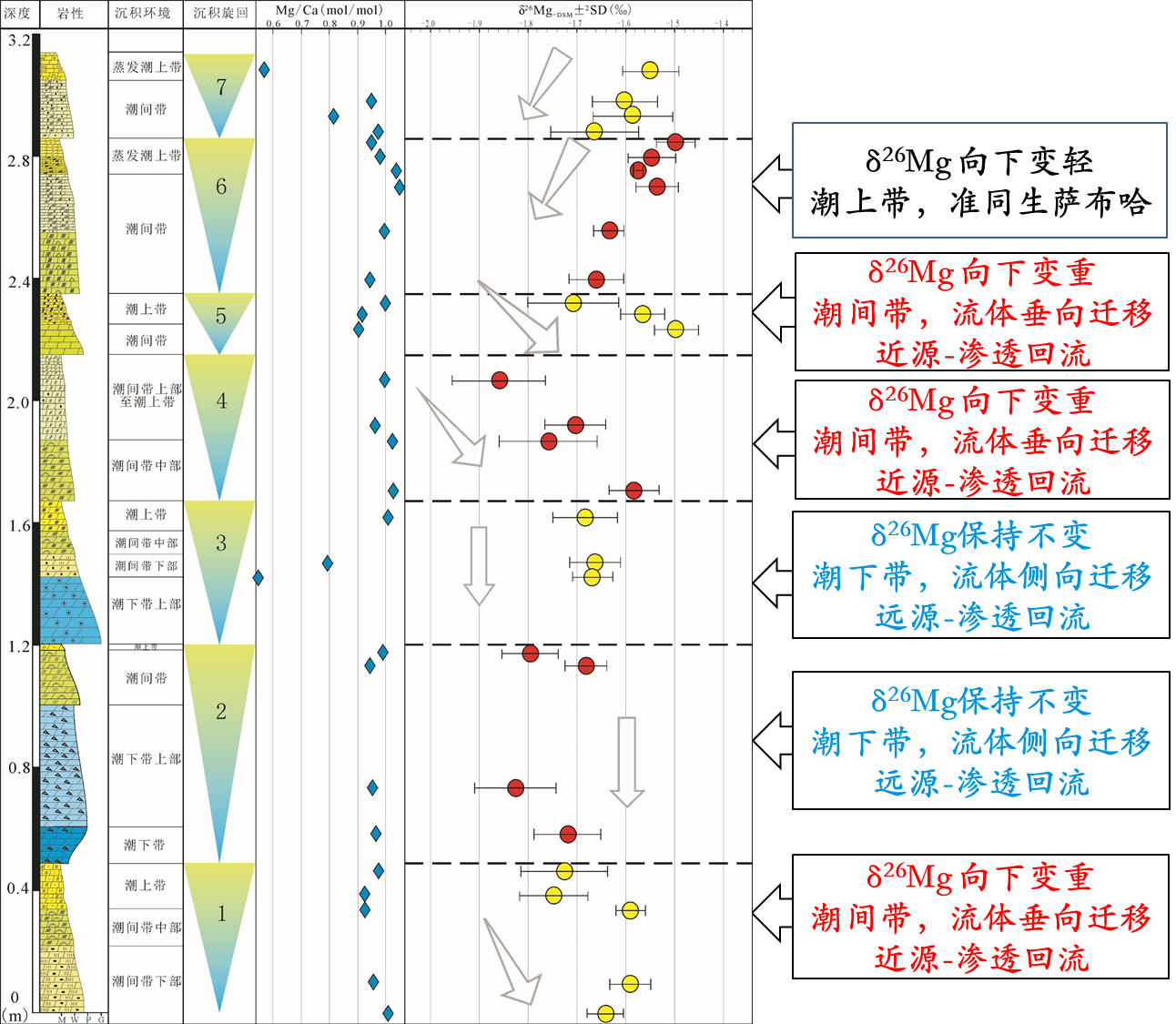通过对扬子板块中寒武统覃家庙组厚层白云岩进行详细的沉积学-地球化学综合研究,发现覃家庙组厚层白云岩由一系列向上变浅沉积旋回叠置而成,代表当时高频率、低幅度的相对海平面波动,其Mg同位素值呈现与沉积旋回一致的周期性变化,说明其白云石化过程与海平面周期性波动相关,利用δ26Mgdol的垂向变化趋势可以约束白云石化流体的流动方向及白云石化过程(图7)。