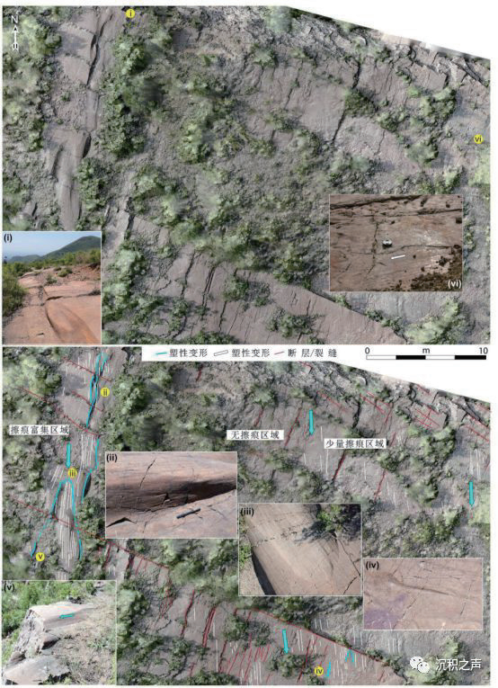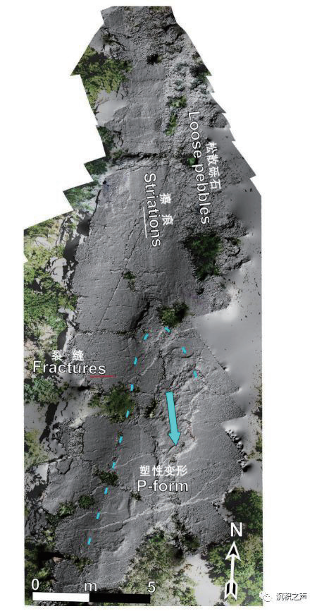 图6石门沟剖面中发育的冰蚀构造(擦痕、塑性锈模构造),蓝色箭头为冰川移动方向