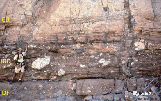 6.3亿年前的雪球地球事件冰川沉积与盖帽碳酸盐组合。DF∶碎屑流沉积;IRD∶冰筏沉积;CD∶盖帽碳酸盐岩;图片来源∶htp∶/www.snowballearth.org/week4.html
