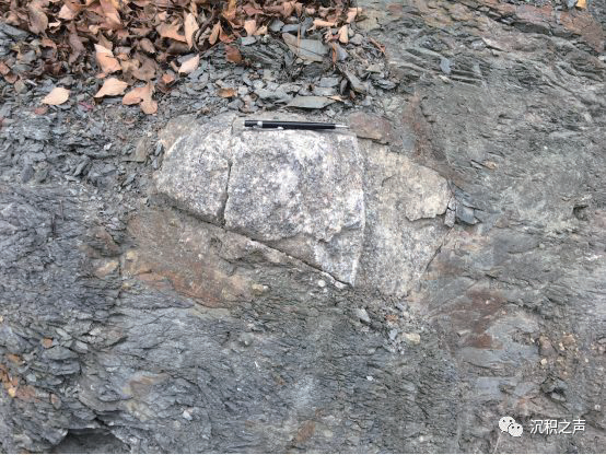 冰川具有极其强大的剥蚀能力。通过冰的刨蚀和磨蚀作用,裹挟在冰川底部和四周的岩石碎属,通过沿着底床滑动或者内部剪切变形作用向前推进,最终以冰筏坠石和冰碛物等形式沉积下来。冰筏沉积(图3)是最常见、最可靠的确定地质历史中曾经存在冰川的直接地质证据,通常发现于深海环境的沉积中。