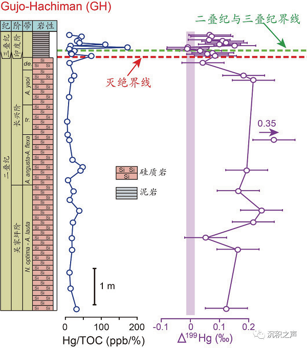 汞浓度和同位素对二叠纪与三叠纪之交海相沉积物火山记录时限和频率有很好制约。汞元素浓度峰值异常波动在26个二叠纪与三叠纪之交的海相剖面都有记录(图3)。研究剖面来自不同的水深(近岸、大陆坡到开阔海洋)和古地理位置(古特提斯洋边缘、泛大陆边缘和泛大洋),具有很好的代表性。在生物灭绝界线附近,所有研究剖面汞元素浓度比背景值高2-8倍,而且奇数非质量分馏(△199Hg)在灭绝界线附近偏移到火山来源汞同位素范围(零值附近)(图3)。全球范围内不同沉积剖面,特别是远离大陆的开阔海域剖面(如图4中的Gujo-Hachiman剖面),汞浓度峰值和同位素异常都指示二叠纪与三叠纪之交沉积物中的汞富集主要是火山来源,汞通过大气循环系统进行传输,导致了在全球范围内同时代岩层中汞富集,而陆源物质带来的汞元素输入不能解释远离陆地区域汞浓度和同位素异常记录(Shen et al.,2019b)。在浙江长兴县煤山D剖面第25层记录中,汞浓度峰值和汞同位素波动与海洋生物大灭绝界线有很好的对应性,指示海洋生物大灭绝和西伯利亚大火成岩省第二阶段对应(高温岩墙侵入到周围沉积盆地,Burgess et al.,2017)。