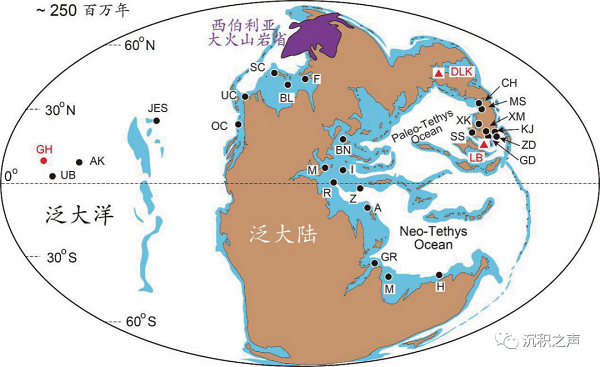 图3二叠纪与三叠纪之交汞元素报道的海相剖面(黑色圆圈)(Shen et al.,2019a)以及本研究选取的两个陆相剖面(红色三角形),LB是华南地区鲁贝剖面,DLK是新疆地区大龙口剖面