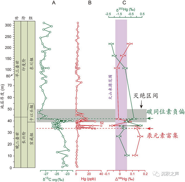 图5华南地区鲁贝剖面有机碳同位素(A)、汞浓度(B)和汞同位素(C)分布(Shen et al.,2019c)