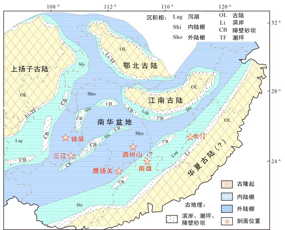 图4 华南东南部新元古代中期古地理图及研究剖面位置 (底图修改自王剑等,2019)