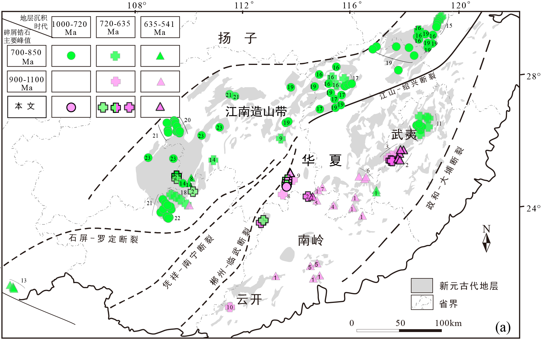 碎屑锆石U-Pb年龄结果显示,华南扬子东南缘、华夏西缘与华夏武夷-南岭地区新元古代中-晚期的年龄谱特征截然不同,因此三个地区的碎屑物质拥有不同的源区(图6)。