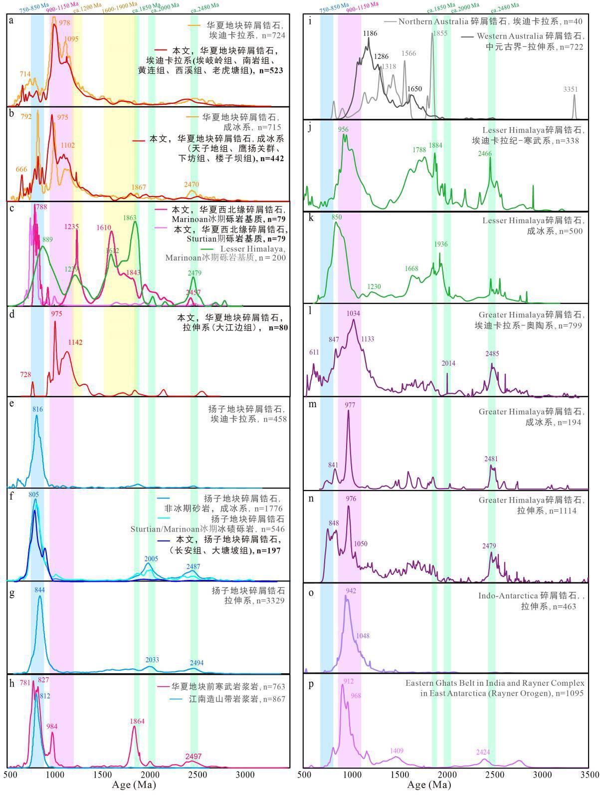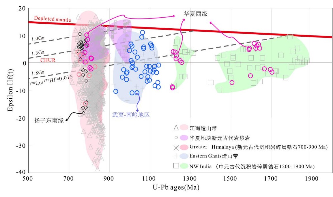 值得注意的是,有三件来自华夏西缘地区的样品均具有850-700 Ma的主峰值,以及少量中元古代至太古宙年龄的碎屑锆石,此外,其中一个样品还含有两个特殊年龄峰值:1880-1600 Ma、1300-1200 Ma。由上述可知,江南造山带大量850-700 Ma年龄的岩浆岩为扬子东南缘同时代碎屑岩提供了大量物源,因此,该年龄的碎屑物源区很可能为华南内部。然而,1880-1600 Ma和1300-1200 Ma年龄的岩浆岩在华南内部十分罕见,而华南新元古代碎屑岩中也缺乏该年龄的碎屑锆石年龄峰值。在与其它板块同时期的沉积物进行碎屑锆石年龄谱对比后发现,Lesser Himalaya地区同时期碎屑锆石年龄谱具有极其相似的年龄峰值。另外,该样品中中元古代碎屑锆石εHf (t)值也与印度西北部中元古代沉积岩吻合。由此推测,华夏西缘部分地区可以同时接收华南内部和外部两个方向的物源供应。