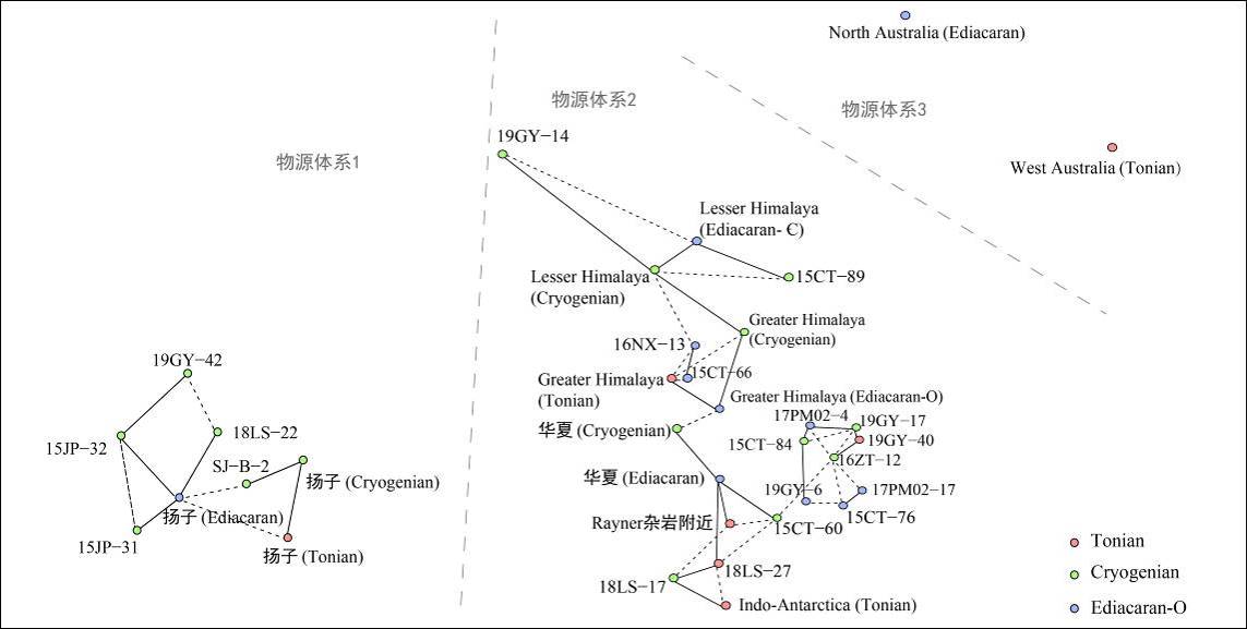 本文华夏武夷-南岭地区成冰纪、埃迪卡拉纪与华夏西缘拉伸纪晚期碎屑岩展示了相同特征的锆石年龄谱,均包含大量来源于华南外部的东冈瓦纳地区1150-870 Ma年龄的碎屑物质。由图8可知,该特征与同时期Greater Himalaya、Lesser Himalaya和Indo- Antarctica地区同时期的碎屑岩锆石年龄谱相似,与North Australia和West Australia相差较大。另外,由MDS分析表明(图9),华南、印度北缘、东南极和澳大利亚板块共存在3个不同的物源体系,分别为:由华南内部江南造山带供给控制的物源体系1、主要受印度北缘Greater Himalaya、Lesser Himalaya及东南极北部(Indo- Antarctica)物源供应的物源体系2、以及与上述均有较大差异的澳大利亚物源体系3。