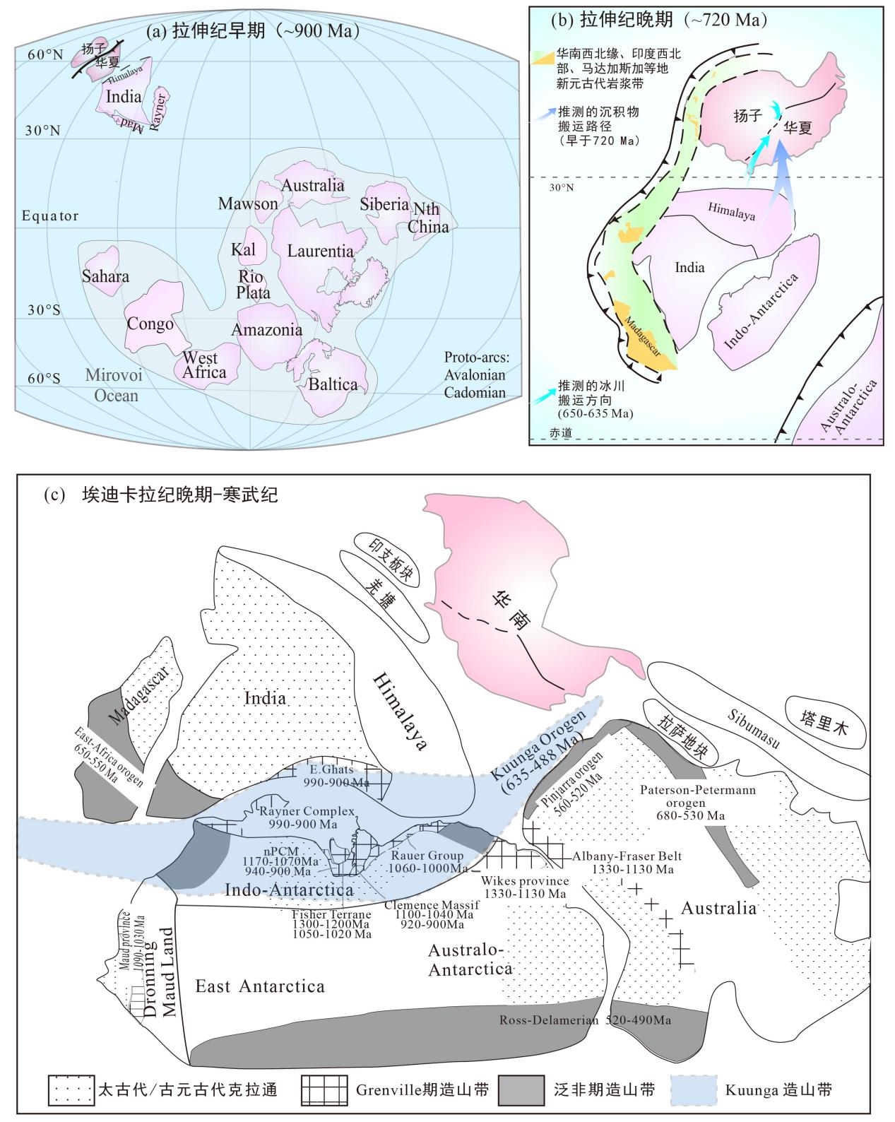 综上所述,扬子与华夏自新元古代早期拼合后,华南东南部可以接收到来自华南地块外部供应的物源,即至少从拉伸纪晚期(约750 Ma)开始华南板块一直与印度北部相连,之后在早古生代早期随着Gondwana大陆的聚合作用,华南-印度(Greater India,包含Greater Himalaya以及Lesser Himalaya)-东南极北部(Indo-Antarctica)与澳大利亚-东南极东部(Australo-Antarctica)沿Kuunga造山带拼合[8](图10),直到约400-385 Ma古特提斯洋的打开导致华南与其他大陆分离。因此,本文支持超大陆复原模式中的“外部”模式,即华南自拉伸纪晚期至埃迪卡拉纪一直与印度北部相连,处于Rodinia超大陆的边缘或外部,而非中心,在新元古代中-晚期从中高纬度向低纬度运动,而劳伦-澳大利亚在新元古代位于赤道附近,与印度和华南存在一定距离。