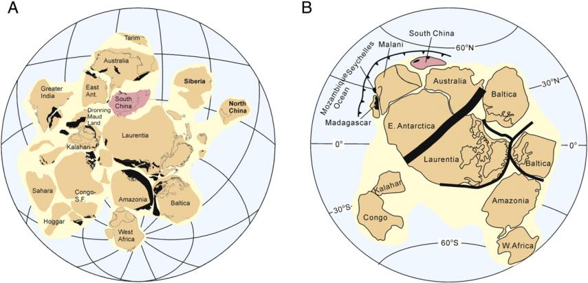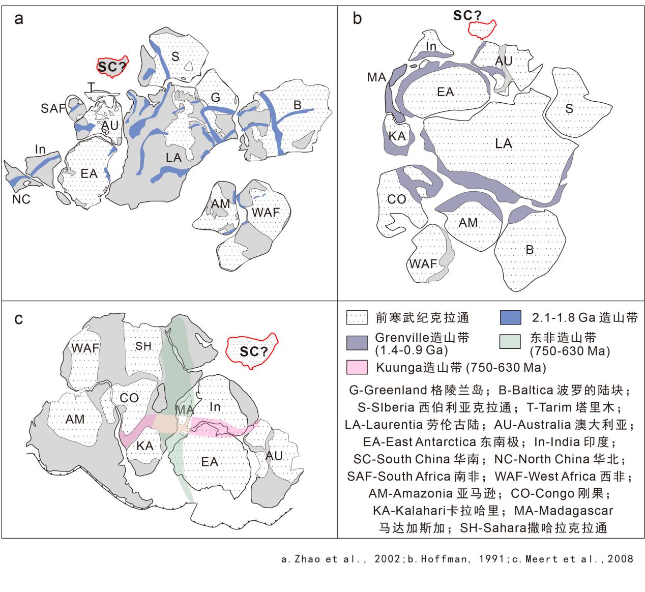 我们可利用包括古地磁、古生物、地质事件对比与地层对比等地质信息来恢复古板块在超大陆中的位置。其中,运用古地磁方法可以迅速而简便地获得板块的古纬度和古方位,是迄今为止最为有效和可信的手段。然而,由于前寒武纪岩石?样品中普遍缺乏高精度的古地磁数据,使得前人对于 Rodinia 超大陆的板块重建仍存在许多不确定性,但运用古地磁方法比较地块的古地磁视极移路径也可以估算古陆块的相对运动量,因此,通过对比不同板块极移曲线的拟合可以确定板块之间的相对位置。近年来,一些学者通过对比古地磁数据也为复原前寒武纪华南古地理位置提供更多的证据,例如:来自湖南马底驿组富赤铁矿红层(约820 Ma)、扬子地块宜昌地区晓峰岩墙群(约820 Ma )、扬子西缘盐边岩墙群(约825 Ma)、云南澄江组红层(约800 Ma 以及印度Malani岩浆岩(约770-750 Ma)和Harohalli岩墙(815 Ma)的古地磁证据表明,华南板块与印度板块在新元古代中-晚期可能具有相似的由中高纬度向低纬度过渡的板块运动特征[4],可能存在着一定地理亲缘性。