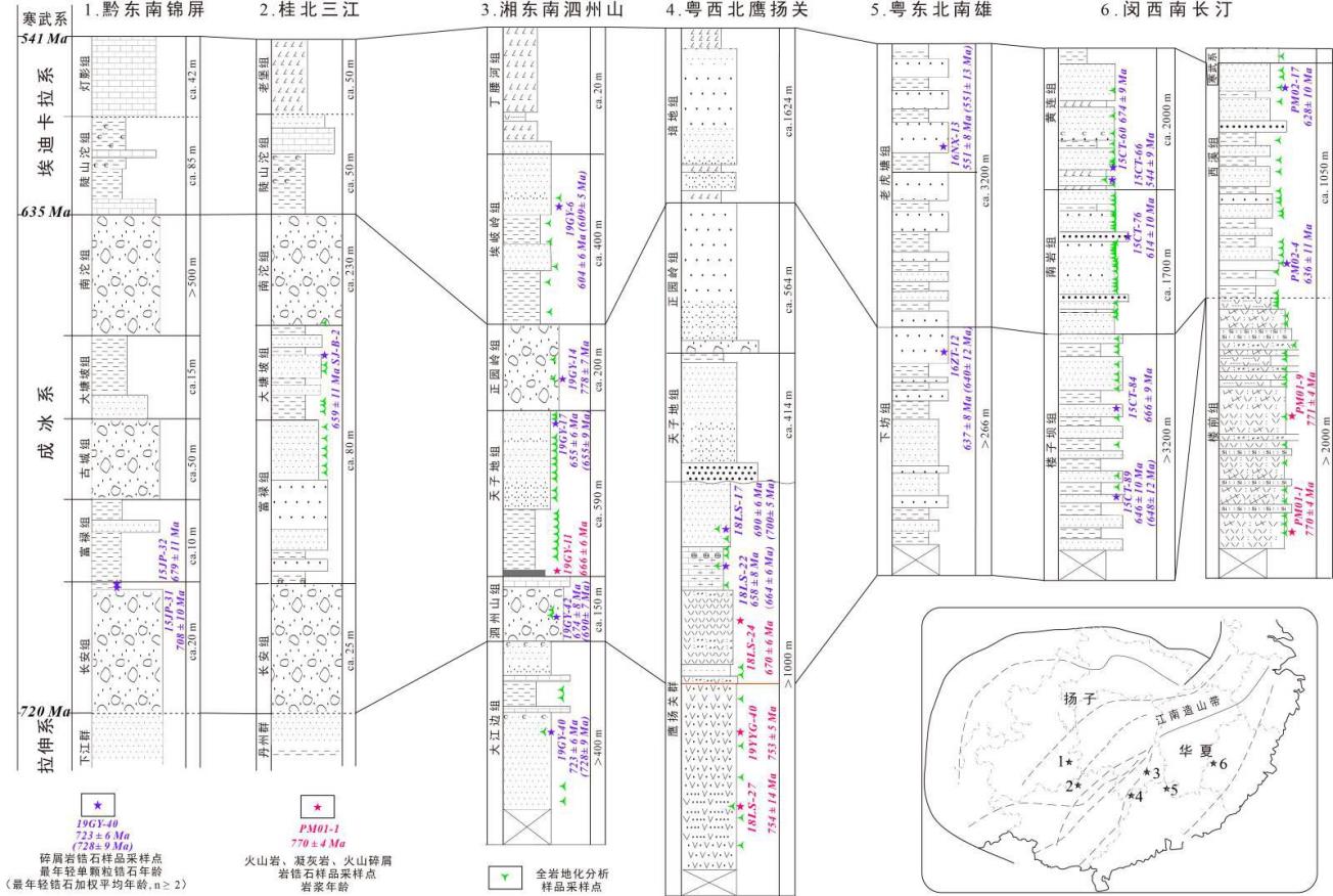 为了讨论新元古代中-晚期(820-541 Ma)华南板块如何参与超大陆演化等全球地质事件,笔者在华南扬子东南缘(三江和锦屏)、华夏西缘(长汀和南雄)、与武夷-南岭(泗州山和鹰扬关)地区,选取拉伸纪晚期-埃迪卡拉纪具有代表性的沉积序列,进行了沉积学、锆石年代学和地球化学等研究(图4、5)。