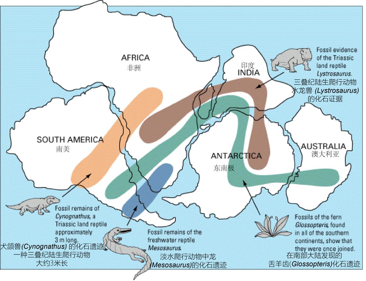 此外,古生物证据也可以提供全球的古生物及古生物群化石分布面貌,为恢复古板块位置提供有效信息。例如,前人利用不同板块在地史时期记录下的同种相似的古生物面貌和生态系统,有效的重建了Pangea超大陆(图2)。然而,由于前寒武纪全球普遍缺乏古生物化石的有效信息,这也就意味着我们需要利用其它有效手段来恢复古板块的位置。沉积物作为陆壳物质风化剥蚀的产物,在地球历史中广泛存在,并保留着地球的岩浆活动和造山事件的记录。碎屑锆石年龄谱对比分析可以为时空上具可对比意义的地块或地层提供亲缘性的决定性证据,因此通过对不同板块相同时代地层的对比以及碎屑岩物源分析,可为超大陆的重建提供重要的证据。