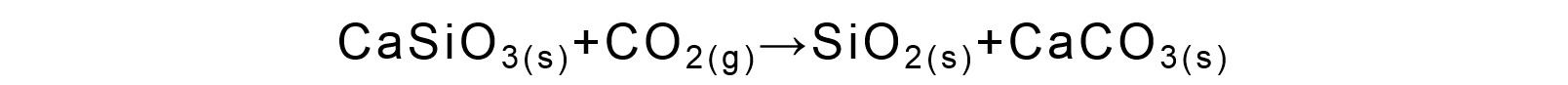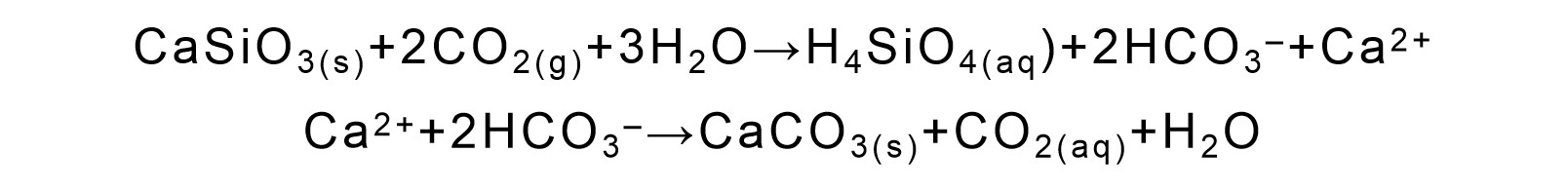 硅酸盐矿物的化学风化消耗大气CO2和水,产生的溶解质(硅酸、碳酸氢根、钙离子)经河流搬运进入海洋,最终以碳酸盐和蛋白石等形式沉淀下来理想的反应过程如下:
