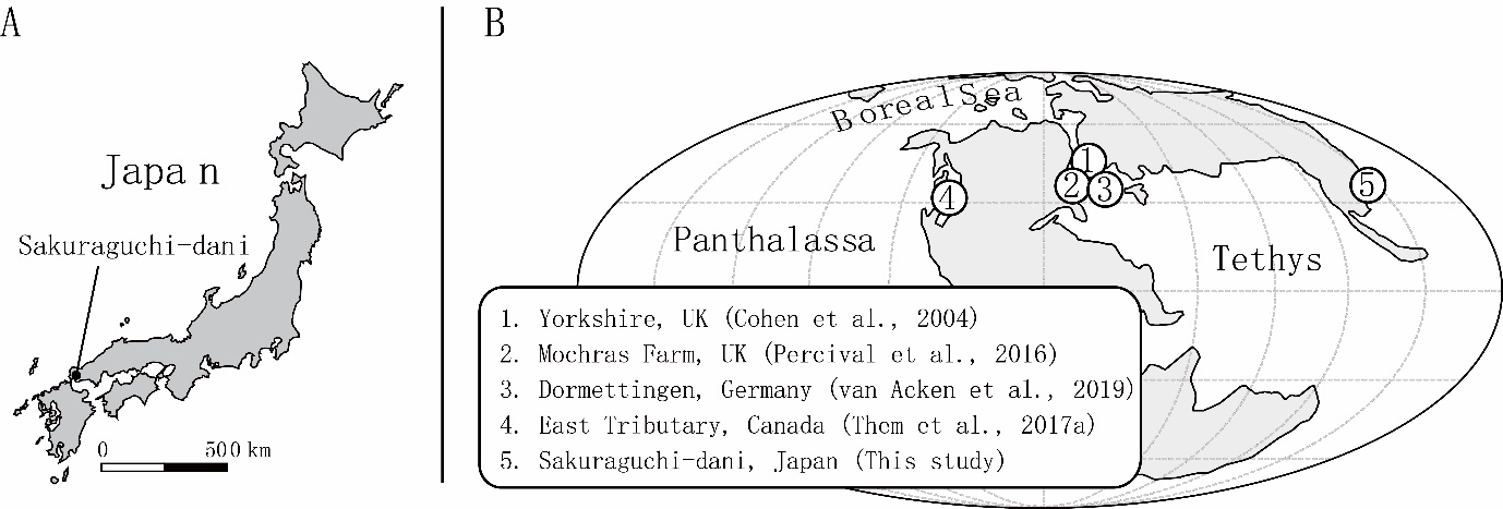 图3. A, Sakuraguchi-dani剖面现今地理位置 (34°08′N, 131°03′E);B,托阿尔阶锇同位素(187Os/188Os)研究区古地理位置图 。图片修改自Izumi et al. (2012)