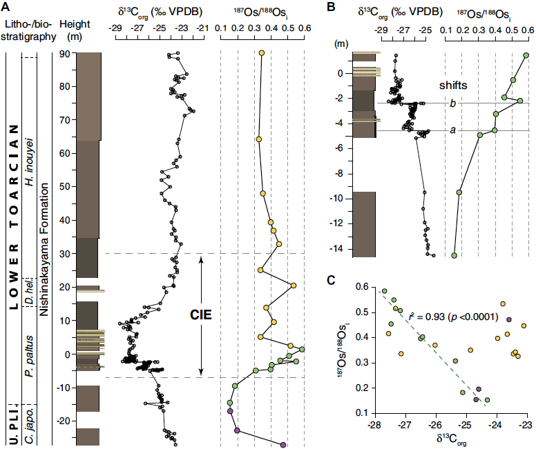 图4. 日本Sakuraguchi-dani剖面T-OAE期间有机碳同位素和锇同位素变化。图A,有机碳同位素在-7至30米段的负偏(CIE)表示T-OAE时期;碳同位素负偏的开始与锇同位素的增加同步;图B,有机碳同位素快速下降(shifts a,b)可能表示快速的(千年尺度)碳释放过程,该变化与锇同位素增加同步,表明风化同步增强;图C,T-OAE开始时,负偏的有机碳同位素值与同期增大的锇同位素值存在极强负相关,表明碳释放与风化变化高度耦合。