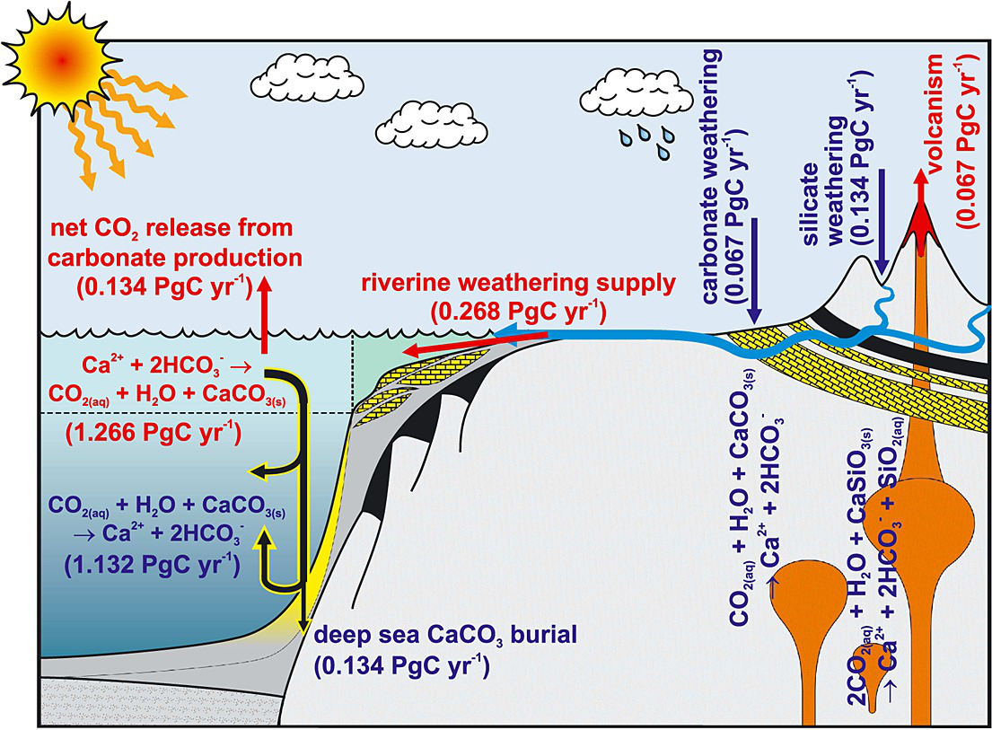 图1. 长期碳循环示意图 (Colbourn et al.,2015)。注释 PgC yr-1:109 克/年