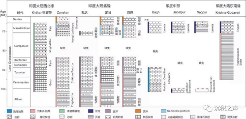 图4晚白垩世印度大陆北缘、中部、西缘及东南部地层对比图。地层上普遍发育向上变浅的序列,其中印度大陆中部地层厚度明显比边缘地区薄,且中部相对边缘地区出现更长时间的沉积间断。