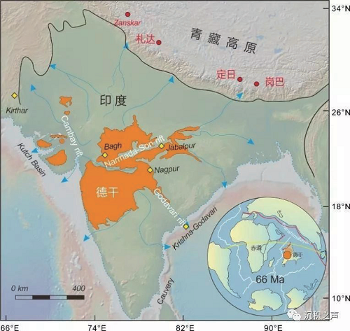 视线让我们移到印度。在地质学家的眼中,印度的地质用一句话可以概括∶一山一陆一火山。"山"指印度北侧的喜马拉雅山,"陆"指印度克拉通基底岩石,"火山"指的是印度中西部超级火山——德干大火成岩省(图2)。这个超级火山目前所能直接观测的熔岩面积约为51.2万平方公里。在地质历史时期,它最大面积一度达150万平方公里,相当于印度国土面积的一半!作为地幔柱作用的典型范例,德干大火成岩省形成于白垩纪-古近纪界线时期(~66 Ma),因其与恐龙灭绝的时代非常一致,与小行星撞击假说一起,长期来被认为是造成白垩纪末生物大灭绝的两大主要原因(Saunders et al.,2007)。