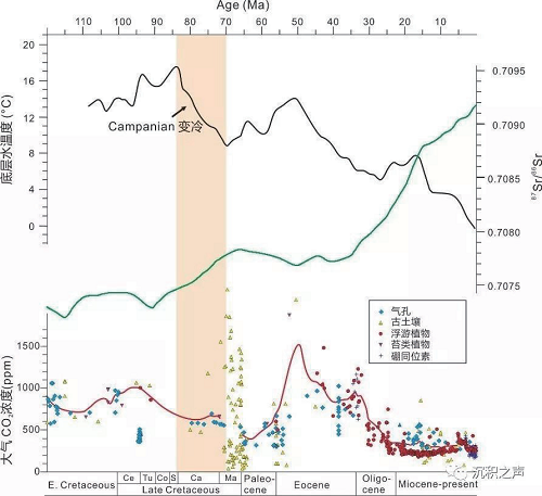 图5晚白垩至今底层水温度、87Sr/Sr及根据各种指针建立起的大气CO2浓度曲线,指示了Campanian期变冷事件,同时伴随大陆风化增强和大气CO2浓度降低