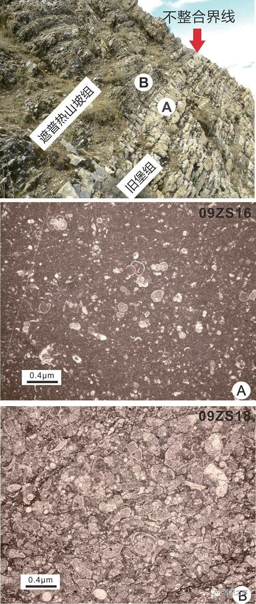 图3 定日地区遮普热山坡组与旧堡组之间不整合上下野外露头及显微薄片照片(Hu et al,2012)